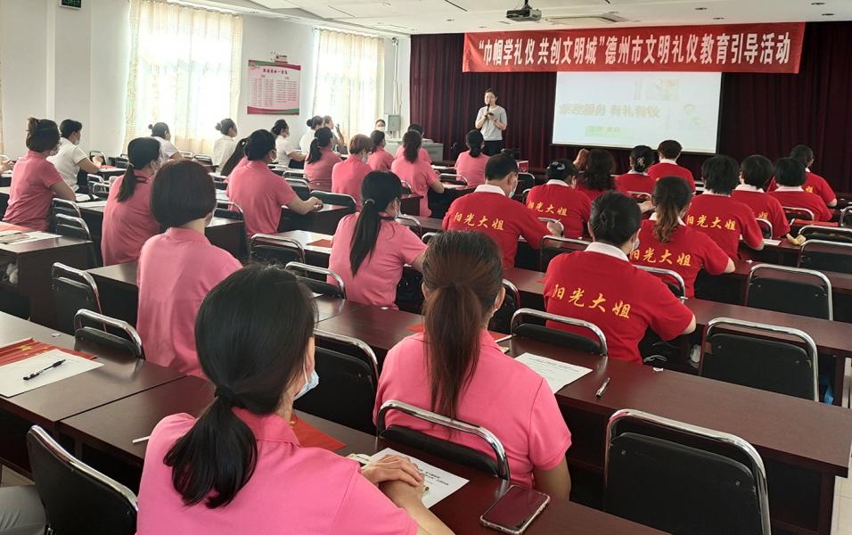 ? ? ? ?6月8日,由山東省婦聯(lián)主辦,德州市婦聯(lián)和山東廣播電視臺承辦的“巾幗心向黨,奮斗新征程”山東省婦聯(lián)新時(shí)代文明實(shí)踐“齊魯女性”宣講活動和德州市婦聯(lián)主辦的“巾幗學(xué)禮儀共創(chuàng)文明城”德州市文明禮儀教育引導(dǎo)活動走進(jìn)德州陽光大姐家政職業(yè)培訓(xùn)學(xué)校。我校校長劉俊杰出席,60余名家政從業(yè)人員參加活動。